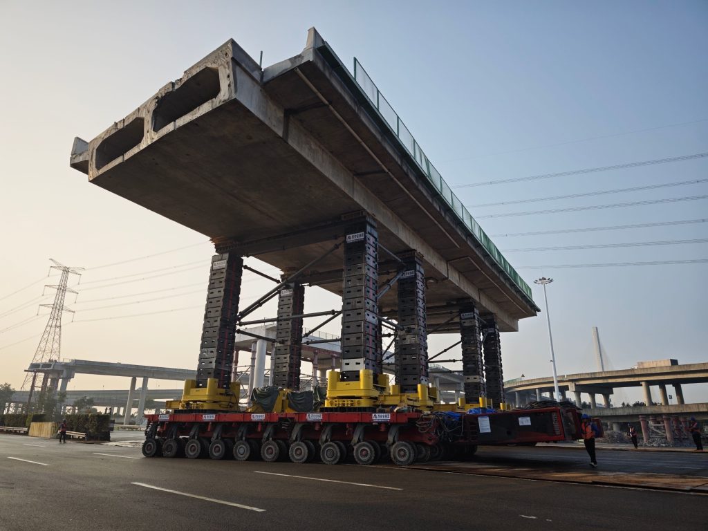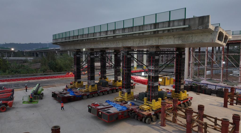 复杂工况攻坚新突破:面对 16 米最大净空、路面坡度大的复杂施工环境,项目团队针对性优化支撑体系设计,8 套液压升降系统具备毫米级同步调节精度,配合 30 轴线 SPMT 模块车的超强承载能力,确保桥体在顶升、移位过程中受力均匀、平稳可控,攻克了高净空环境下支撑稳定性与坡度适应性的核心技术瓶颈,为同类复杂工况工程提供了成熟范本。